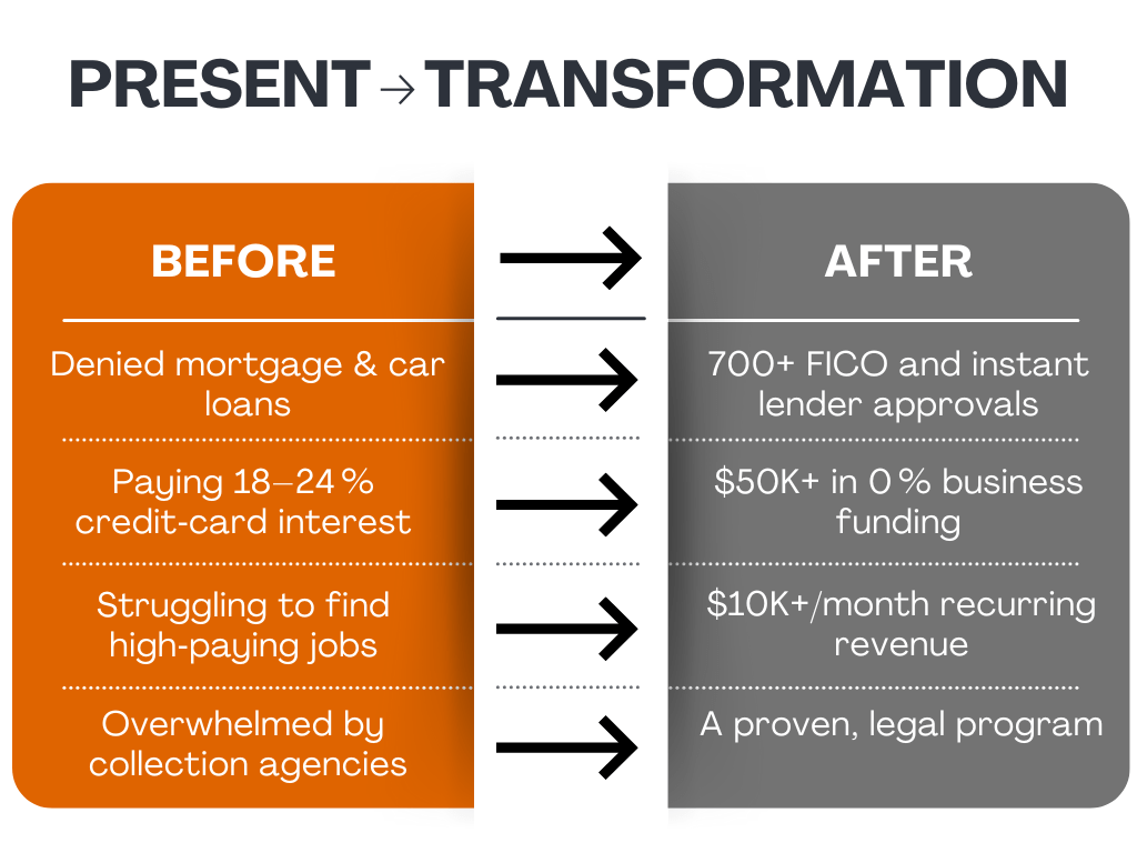 Our clients come to us frustrated, overwhelmed, and unsure of their next move. They leave with clear strategies, improved positioning, confidence navigating credit and capital. Results vary by profile, but clarity is guaranteed.