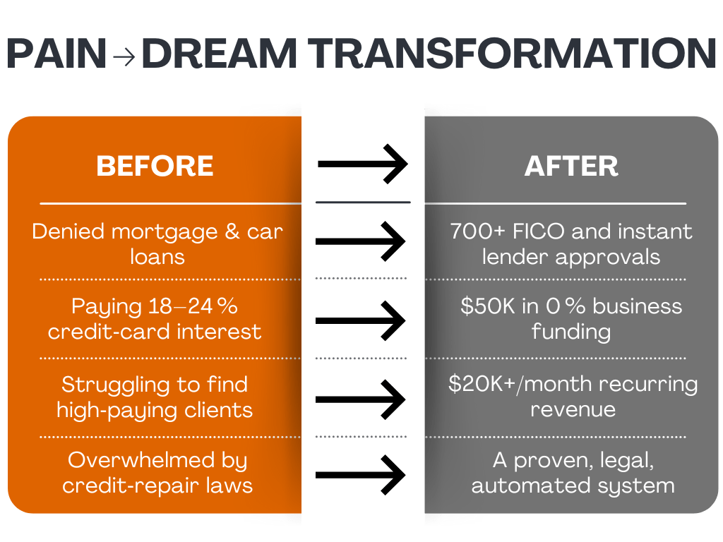 Master the complete Credit Healing system that raises FICO scores, attracts premium clients, and hands you the exact scripts, templates, and automations we use every day.