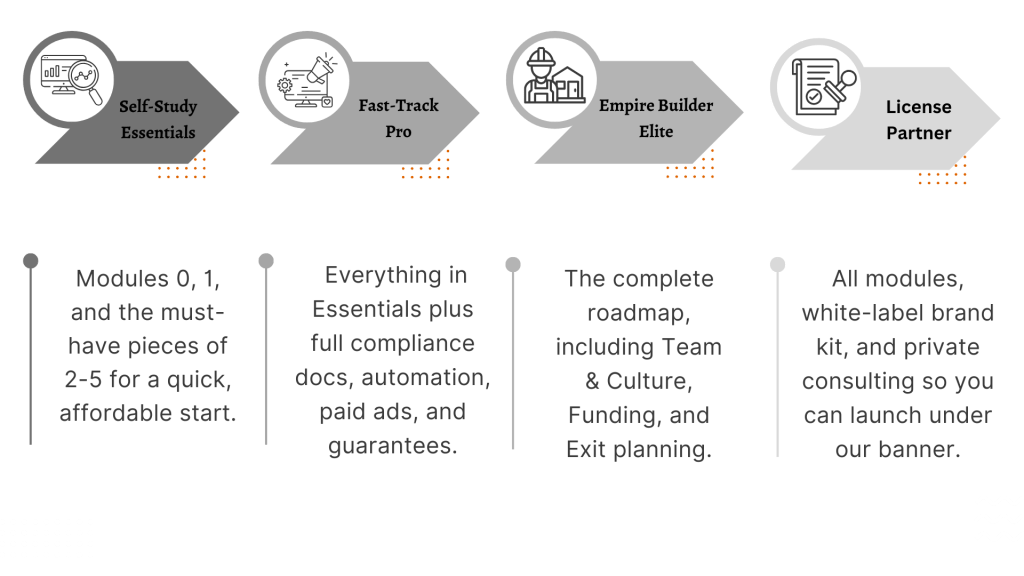 A 10-module journey that takes you from “interested” to fully-operating credit-healing CEO, then shows you how to fund and even exit the business.